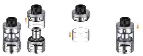 Unscrew to remove the top hardware; Change the old tank tube with a new one; Screw the top hardware back into place. Note: The picture below is for tank with 4 ml glass tube.